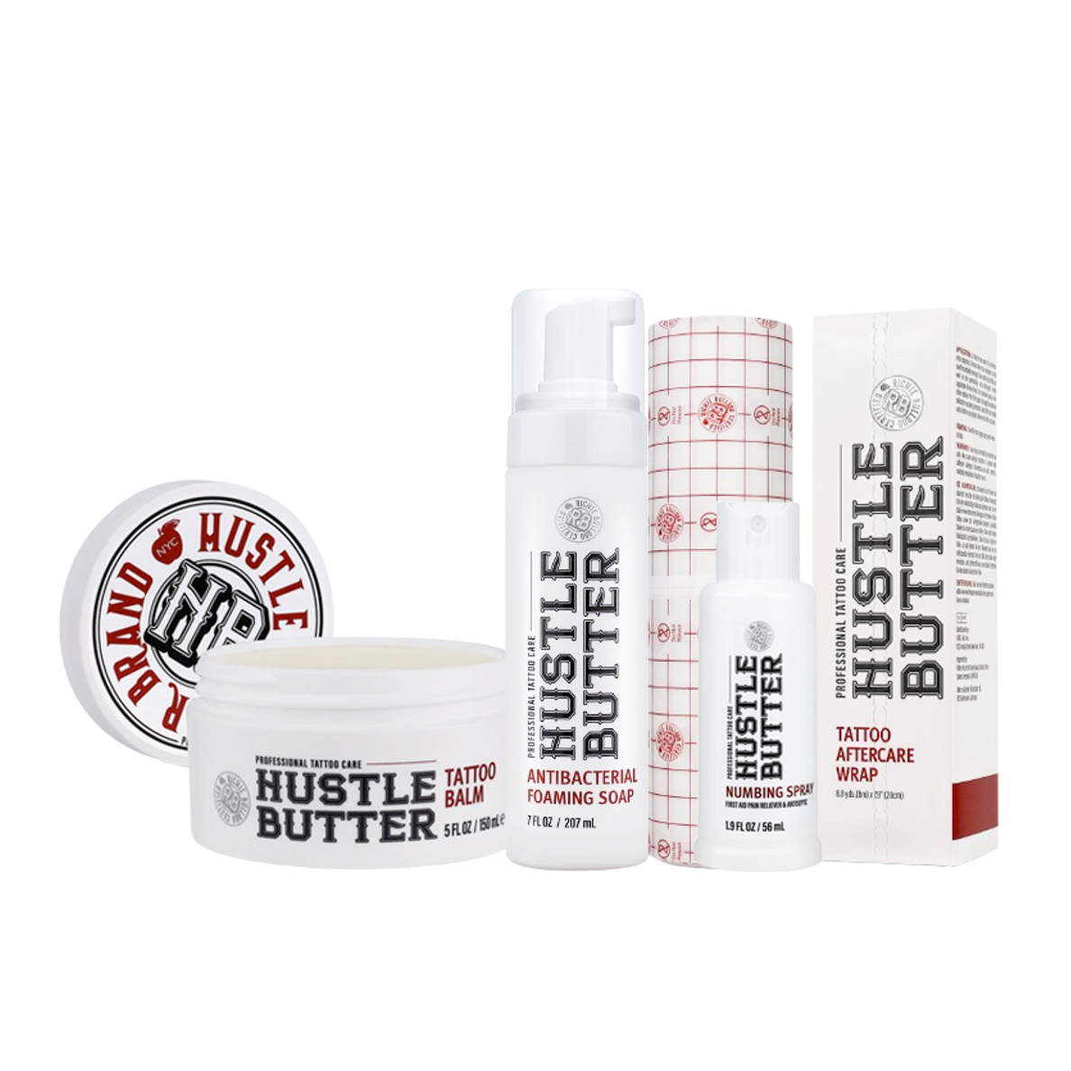 Bundle includes: 1x Hustle Butter Tattoo Balm (5 fl oz), 1x Hustle Butter Antibacterial Foaming Soap (7 fl oz), 1x Hustle Butter Numbing Spray (1.9 fl oz), 1x Hustle Butter Tattoo Aftercare Wrap (Professional Size - 7.9 in x 8.8 yds)