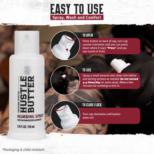 Your session, uninterrupted—comfort where it matters. Hustle Butter Numbing Spray is made for use during the tattoo session as a fast-acting spray that temporarily numbs the area while delivering an antiseptic cleanse. It helps keep the skin comfortable and prepped so artists can stay in the flow and clients can power through with less stress. Lightweight, no-mess, and easy to apply, it’s the in-session companion that delivers more comfort and keeps everything moving smooth. Because smoother sessions = better results.